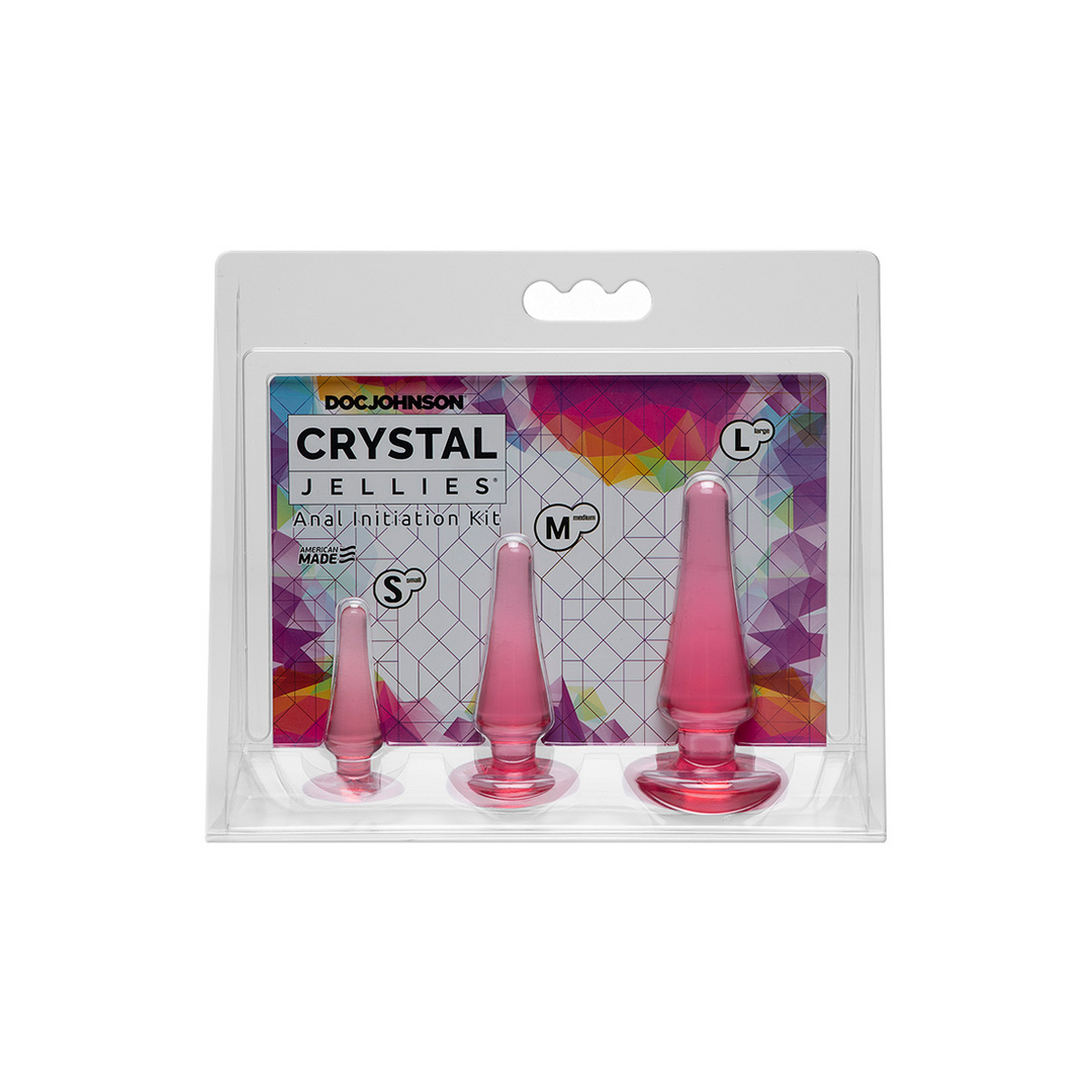 The Crystal Jellies Anal Initiation Kit allows beginners to ease into backdoor play while enjoying each stage of intensity and fullness. Three classic plugs in smooth, body-safe material sized at one-inch intervals offer progressive levels of sensation, while flared bases and a firm yet flexible feel ensure safe and versatile fun. Experienced backdoor enthusiasts can also enjoy this set as the warm-up for a night of more extreme intimate exploration.
