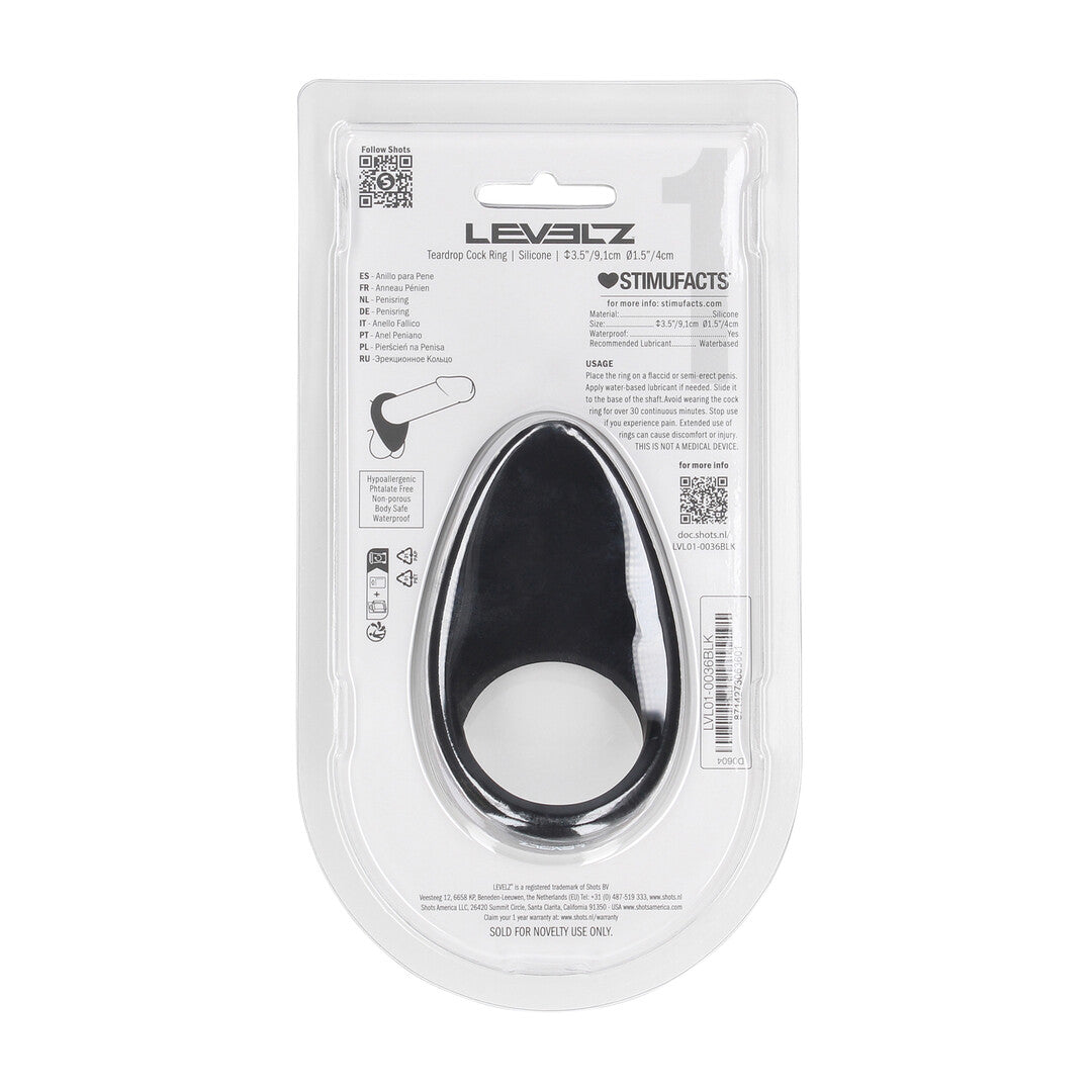 Refined, ergonomic, and built for impact—this teardrop-shaped cock ring from the LEVELZ collection delivers both style and function. Its unique shape provides targeted pressure while accommodating both the shaft and base comfortably. Made from smooth, body-safe silicone and packaged in a sleek clamshell, this non-vibrating ring is ideal for users seeking an elevated fit and feel.