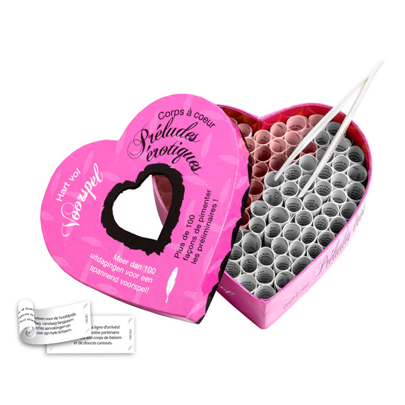 Dans ce corps à coeur Préludes érotiques, vous trouverez des défis spécialement pensés pour apporter les pré-requis indispensables à des préliminaires agréables et relaxants. Les défis sur les rouleaux blancs sont pour lui, ceux des rouleaux roses, pour elle. Les jaunes sont des défis qui requièrent un peu plus de préparation et qui seront à accomplir un ou deux jours plus tard. Redoublez d’excitation en anticipant vos jeux de préliminaires à venir!