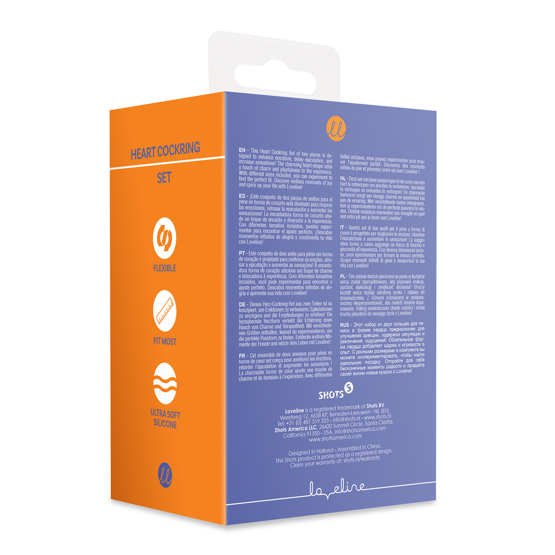 De Hart Cockring Set van twee stuks is ontworpen om erecties te verbeteren, ejaculatie uit te stellen en sensaties te verhogen! De charmante hartvorm voegt een vleugje charme en speelsheid toe aan de ervaring. Met verschillende maten inbegrepen, kun je experimenteren om de perfecte pasvorm te vinden. Ontdek eindeloze momenten van plezier en geef je leven meer pit met Loveline! De kleinste ring is 4,5 x 0,5 x 3,9 cm en de binnendiameter is 2,9 cm. De afmetingen van de grootste ring zijn 5,8 x 2,4 x 5,5 cm en de binnendiameter is 3,9 cm.