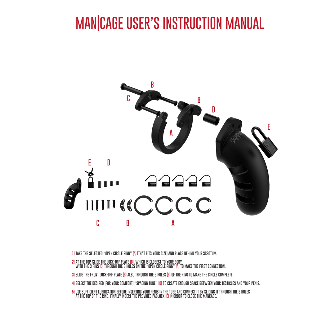 Feel the ultimate power as the key holder of your partners most intimate parts. Experience the most liberating feelings when opening the lock. All control is in the hands of your Dominant. This Mancage is an absolute must for people who love kinky BDSM! With this Mancage you prevent an erection by 'cageing' your penis - which builds up to an extreme release when it is removed. Due to the medical grade silicone it is safe to wear all day long, and is supple under clothing. This way you can wear it secretly, but with ease, anywhere you go. It can be adjusted at several points and is available in two sizes. There are five different rings and different spacers to measure it perfectly. It has functional openings for ventilation and toileting and is easy to clean. This Mancage comes with several plastic clasps, to be used if extra discretion is required (like security checks). These locks can be cut loose when the time comes for the ultimate release. A sturdy metal lock is also included. Looking for something really exciting and naughty? Do you want to be thoroughly controlled by your partner? This Mancage gives the opportunity to take all power or to completely hand it over to your partner. Kinky? That is a sure thing. Play safe, go for comfort and only allow discomfort or pain when asked and no one is harmed in the long run. Take off the cage while sleeping.