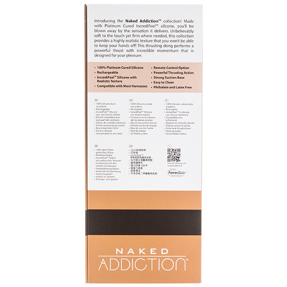 Uit de Naked Addiction-collectie is deze 9-inch (22,9 cm) stotende dong gemaakt met Platinum Cured IncrediFeel ™ -siliconen die ongelooflijk zacht aanvoelt, maar toch stevig is waar nodig en je een zeer realistische textuur biedt waar je niet vanaf kunt blijven!