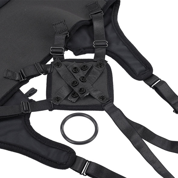 Zes verstelbare elastische banden verbinden de voorste padding voor nauwkeurige plaatsing van de dildo