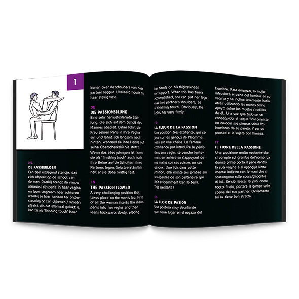 De 24 uitdagingen in de Kama Sutra editie zijn in 10 talen: Engels, Spaans, Frans, Duits, Nederlands, Pools, Russisch, Italiaans, Zweeds en Noors en geven je seksleven een uitdagende draai naar meer variatie en sexy sensatie.