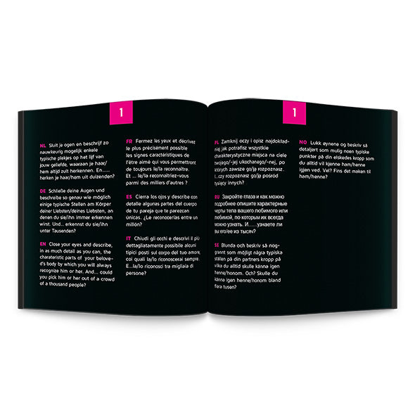 De 24 uitdagingen in de Love & Marriage editie zijn en in 10 talen: Engels, Spaans, Frans, Duits, Nederlands, Pools, Russisch, Italiaans, Zweeds en Noors en geven je seksleven een opwindende draai naar (nog) meer hartstochtelijk genot. Durven jullie de gok te wagen? Beleef jullie liefdevolle en erotische momenten samen.