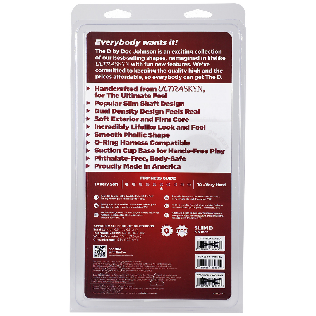 The Slim D, one of Doc Johnson's most popular shapes, has a width that is pleasurable and comfortable for most bodies and is available in both FIRMSKYN and dual density ULTRASKYN. Dual density ULTRASKYN warms to the touch and is designed with a soft exterior and firm core to emulate the feel of a real penis, while the FIRMSKYN option offers a firmer feel in a classic pleasure product material.