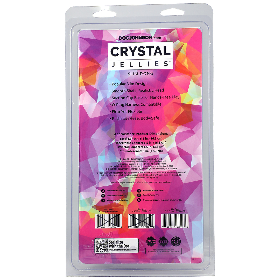 The Crystal Jellies 6.5-Inch Slim Dong features a smooth, streamlined phallic shape in one of Doc Johnson's most popular slim widths. The sheer body-safe material shimmers in an assortment of beautiful crystalline tones from the firm rounded head to a built-in suction cup base that seamlessly enables hands-free fun.Our crystal balls predict pure pleasure in your future.